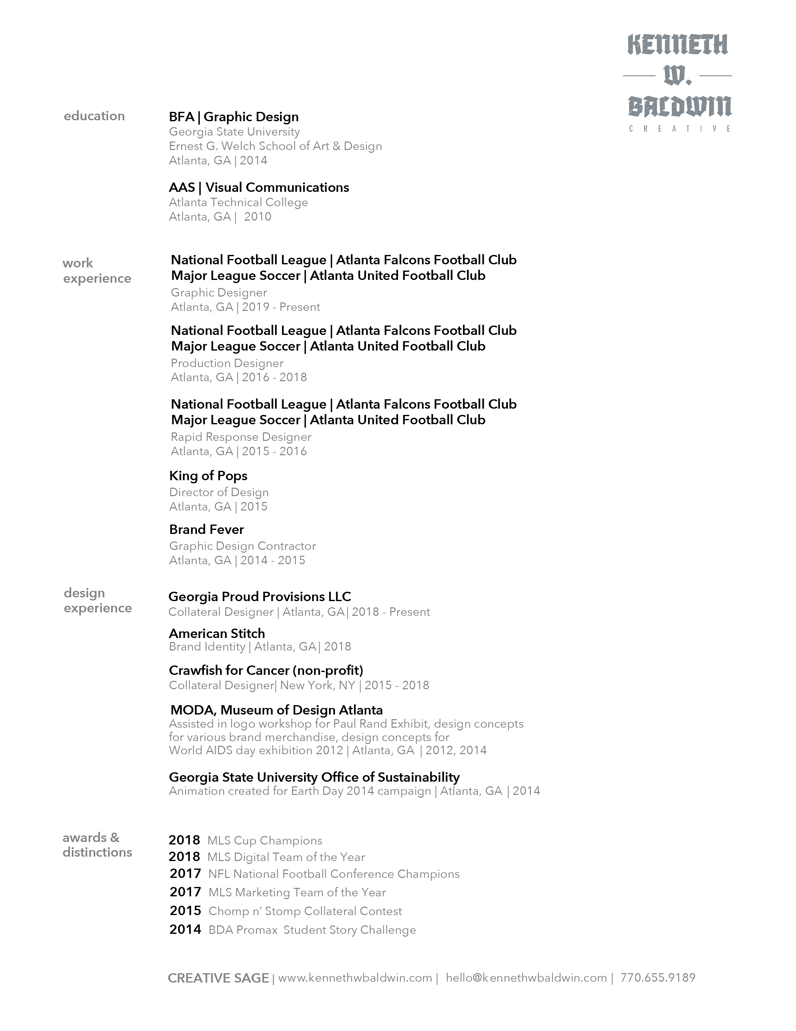 As a designer, in the past years I have acted as a creative for design agencies and produced digital, print, and video projects with the brands such as The Atlanta Falcons, Atlanta United FC, King of Pops, The King Center, Wing Zone, The High Museum of Atlanta, Museum of Modern Design (MODA), Crawfish for Cancer, The Giving Kitchen, Killercrete Precast Concrete LLC, World Summit of Nobel Peace Laureates and The Atlanta Science Festival. I am able to work in a fast paced environment and possess significant experience in designing for collateral and brand development.